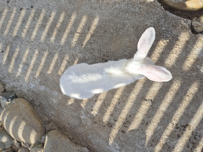 - "An overhead view captures a white rabbit positioned on a light-colored, granular surface, consistent with concrete or packed earth" by FM-vOprn2, licensed under CC BY 4.0