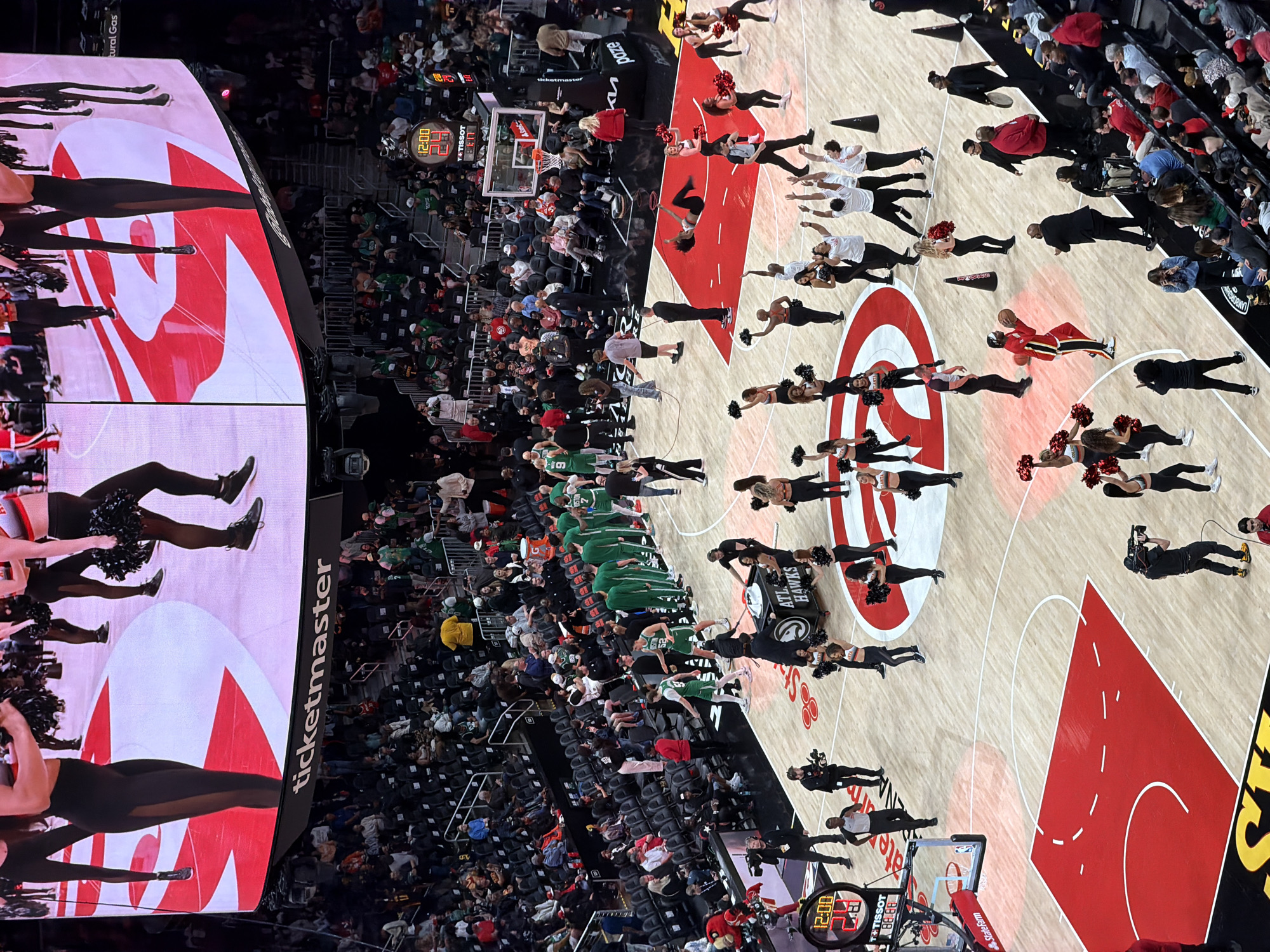 basketball game at an arena with a large screen displaying dancers and the word "ticketmaster." The basketball court displays the logo of the Atlanta Hawks. Cheerleaders are performing on the court. Spectators fill the seats around the court. Several players are wearing green uniforms. The scoreboard displays "12:00" and "88.88," along with the logo of Tissot, along with the words StateFarm, and Natural Gas. The arena is likely located in Atlanta, United States of America.