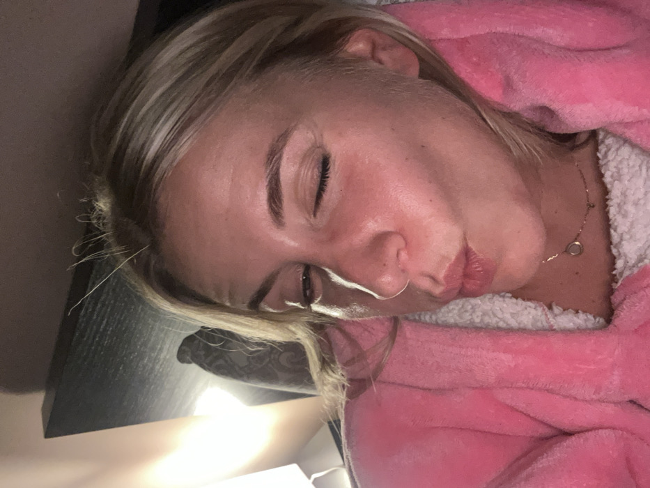 A blonde woman lies on her side, eyes closed, wearing a pink robe with a white fluffy collar. She has a necklace with small circular pendants. The image is rotated, with her head near the top right. Part of a dark wooden headboard and pillow is visible in the top left corner. A bright light shines from the bottom of the frame, casting a distinct line across her face.