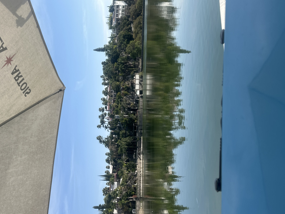 Still water reflects the lush green landscape of a hillside dotted with buildings. Palm trees are prominent among the foliage. The scene is framed by the corner of a light-colored umbrella on the left and a blue structure on the right, suggesting the viewer is seated nearby. The overall impression is one of calm and relaxation.