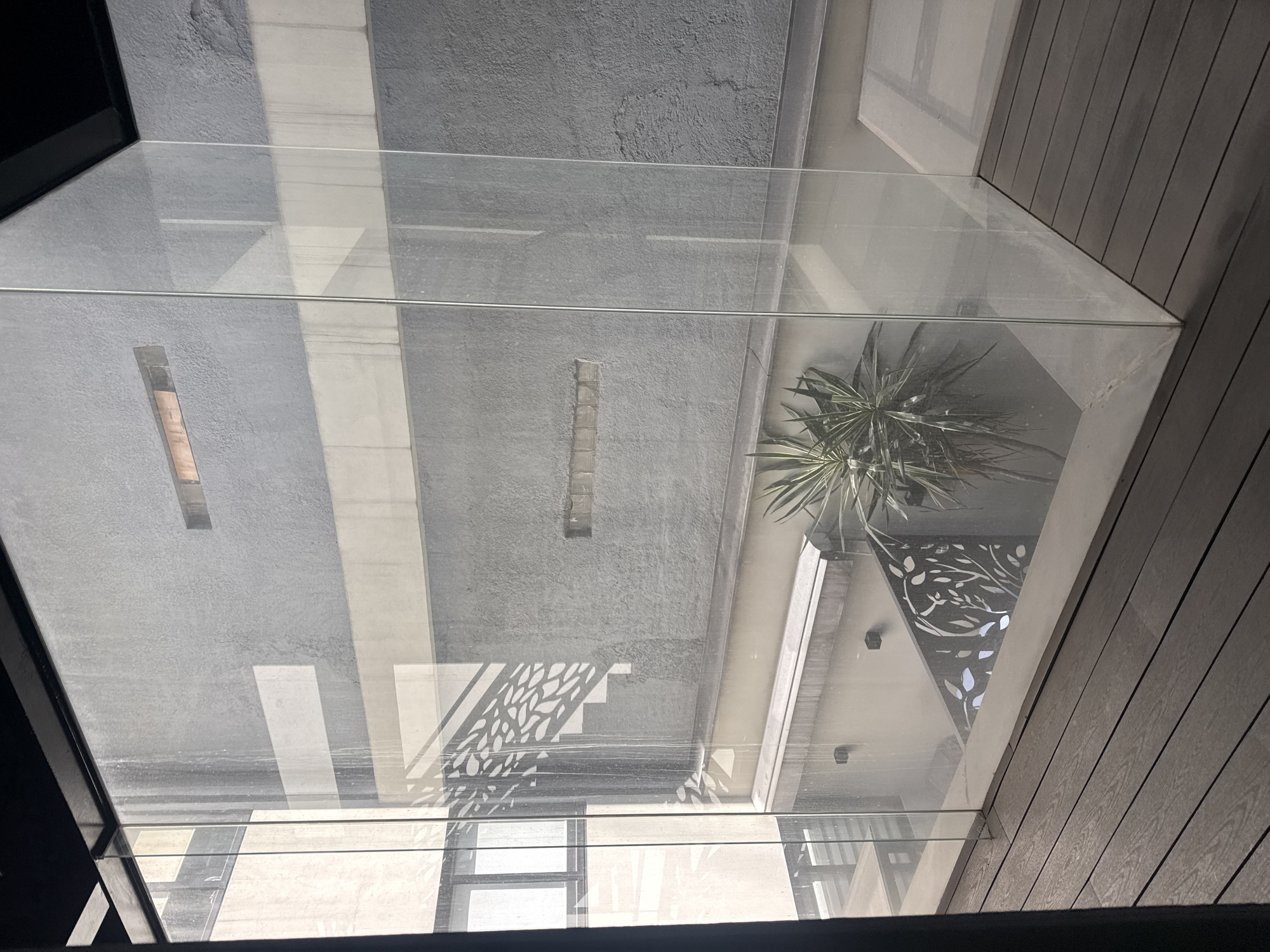 The image depicts an upward view through a glass panel, possibly a skylight or a window, providing a glimpse of an outdoor space. The outdoor space appears to be a courtyard or a small garden, featuring a wall with decorative perforations, a potted plant with spiky leaves, and a light-colored wall. Above the outdoor space, a gray wall with a narrow opening or a decorative element is visible. The image exhibits a perspective that suggests it was taken from inside a building or structure looking up. The scene is in Mexico City, Mexico.
