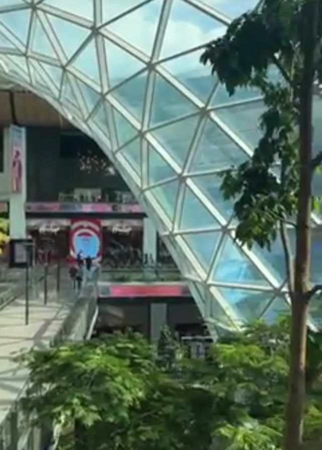 interior of a building with a large, triangular, glass-paneled ceiling, through which sunlight streams. In the foreground and middle-ground, lush green trees and plants are visible, suggesting an indoor garden or green space. A walkway runs through the greenery, and people can be seen walking along it. In the background, there are storefronts, including one with a large red sign, likely indicating a retail area within the building. The camera slowly pans upwards, emphasizing the height and architectural design of the building, particularly the geometric pattern of the glass ceiling. Overall, the scene depicts a modern indoor space that blends natural elements with architectural design, creating a visually appealing environment.