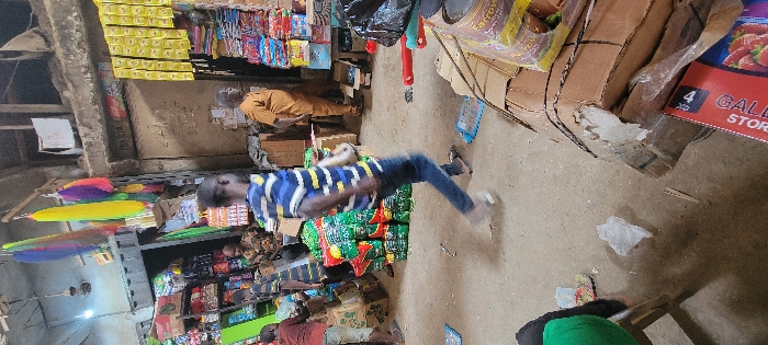 The image displays an active indoor market scene in Onitsha, Nigeria. The floor is an unpaved, light-colored surface, scattered with debris including plastic bags, wrappers, and blue rectangular objects. In the mid-ground, a male individual walks from left to right, his motion blurred. He wears a blue and yellow striped short-sleeved shirt, dark blue jeans, and dark sandals. To his immediate left are multiple large, green-patterned sacks stacked vertically. Further left, a person wearing a red shirt and light-colored shorts is partially visible near more merchandise. In the background, another male individual stands on the right, dressed in light brown traditional Nigerian attire. He is positioned near a stall packed with various consumer goods, including shelves filled with colorful packages and vertically suspended yellow-packaged items. A metal rolling shutter door is visible behind him, displaying faint red lettering and a Coca-Cola logo. To the far left in the background, another stall is filled with goods. Overhead, several elongated, brightly colored fabric items (blue, yellow, purple, green) hang from the ceiling structure, alongside a visible ceiling fan and fluorescent lighting. The foreground on the right features stacked cardboard boxes, some exhibiting damage. A red box labeled "GALA STORE" with an image of strawberries is visible at the bottom of the stack, and yellow-labeled packages are on top.