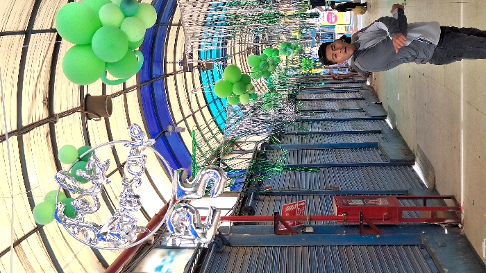 The image displays a covered pedestrian walkway in José Luis Bustamante y Rivero, Peru, adorned with festive decorations. The ceiling consists of translucent corrugated panels, primarily clear/white, with a section of blue panels towards the right, supported by a metal framework. Numerous light green spherical balloons are clustered and suspended from the ceiling. Long, shimmering green and silver streamers also hang from the ceiling, creating a celebratory atmosphere. On the left side, silver foil balloons spell "Feliz Aniversario" within a circular frame, and below this, the number "25" is formed by silver foil balloons, attached to a vertical red pipe. A red fire extinguisher cabinet is mounted on this red pipe. The walls lining both sides of the walkway are composed of closed blue metal roller shutters. In the foreground, slightly right of center, a male individual is present. He is of Hispanic ethnicity, wearing a gray and white hooded sweatshirt and dark pants. He is positioned with his body angled right and his head turned towards the camera, mouth open, with arms bent or crossed. An earring is visible in his left ear. In the distant background, several indistinct figures can be seen walking, one carrying a yellow bag. The floor is a light-colored concrete or paved surface. A dark, small bucket hangs from the ceiling structure above the decorated area.
