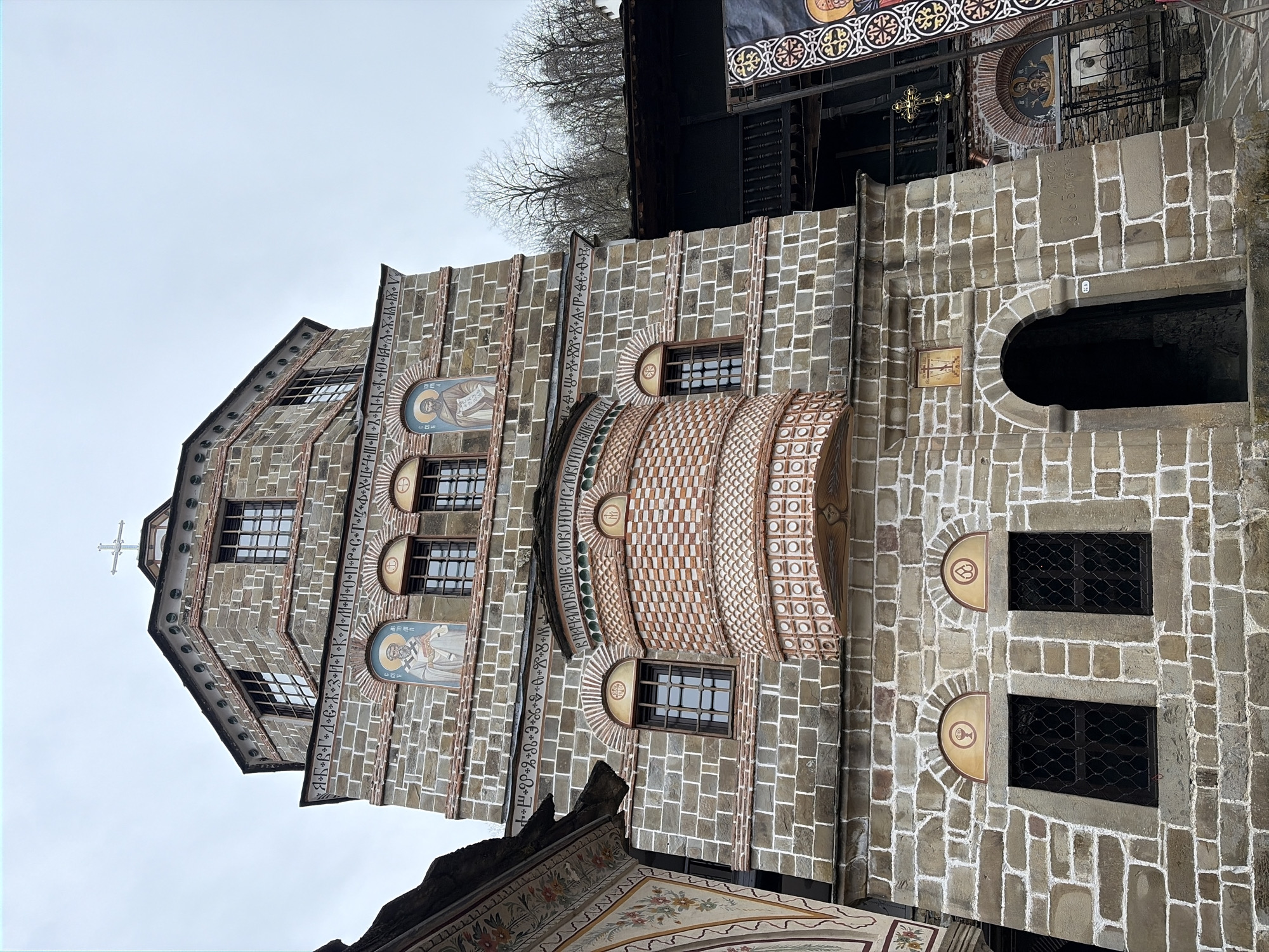 Troyan Monastery in Oreshak, Bulgaria, a historic structure built of stone, including a tall bell tower with a cross at the top. The facade has several windows, and decorative details, including arched brickwork, and religious iconography painted on the walls. The stone is laid in an irregular pattern, with contrasting mortar. Cyrillic text is etched into the walls along the side of the bell tower. Some bare trees are visible in the background behind the building.
