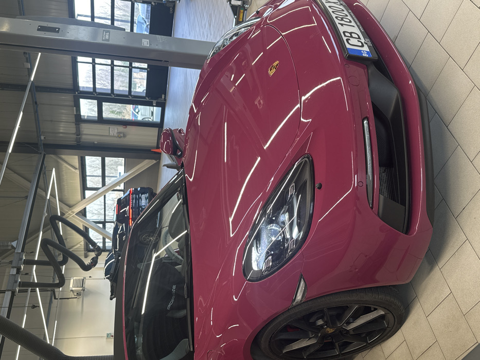 - "The image displays the front-left three-quarter view of a dark pink (magenta) Porsche 718 sports car, parked indoors within an automotive service facility or showroom" by FM-Auf722, licensed under CC BY 4.0