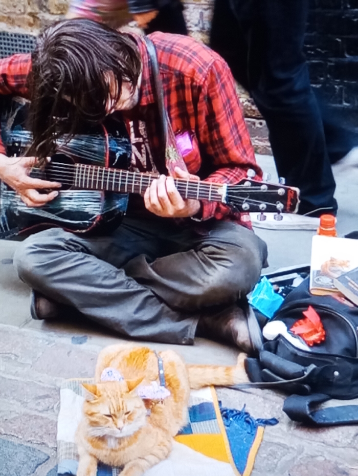 - "The scene depicts a street musician and a cat situated on a paved surface in Riga, Latvia" by FM-1UPjC3, licensed under CC BY 4.0