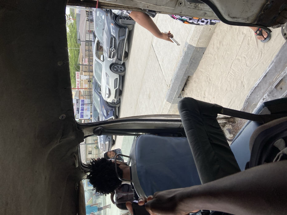 The scene, captured from within a vehicle, displays an exterior view in Lekki, Nigeria, specifically near South Gold College and Hopeville Estate