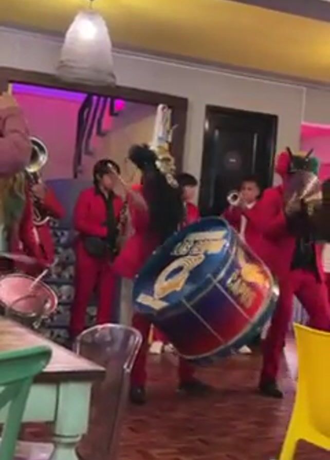 A group of musicians wearing matching red outfits and elaborate masks are performing in what appears to be a restaurant. The band includes a drummer with a large drum that says "LOS CHUPAROS", a trumpet player, a tuba player, and other musicians playing wind instruments. A person in a casual outfit records the performance with their phone. The restaurant has eclectic décor, with colorful walls, patterned tables, and unusual light fixtures.