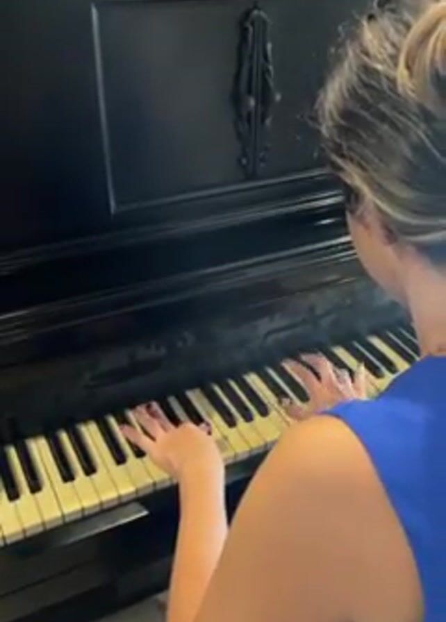 A woman from the back is playing a black upright piano. She is wearing a blue top. The piano has white and yellow keys and an ornate design in the center.
