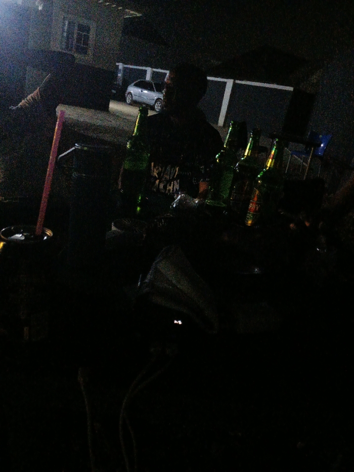 The image depicts a dimly lit nighttime outdoor social gathering in Abuja, Nigeria