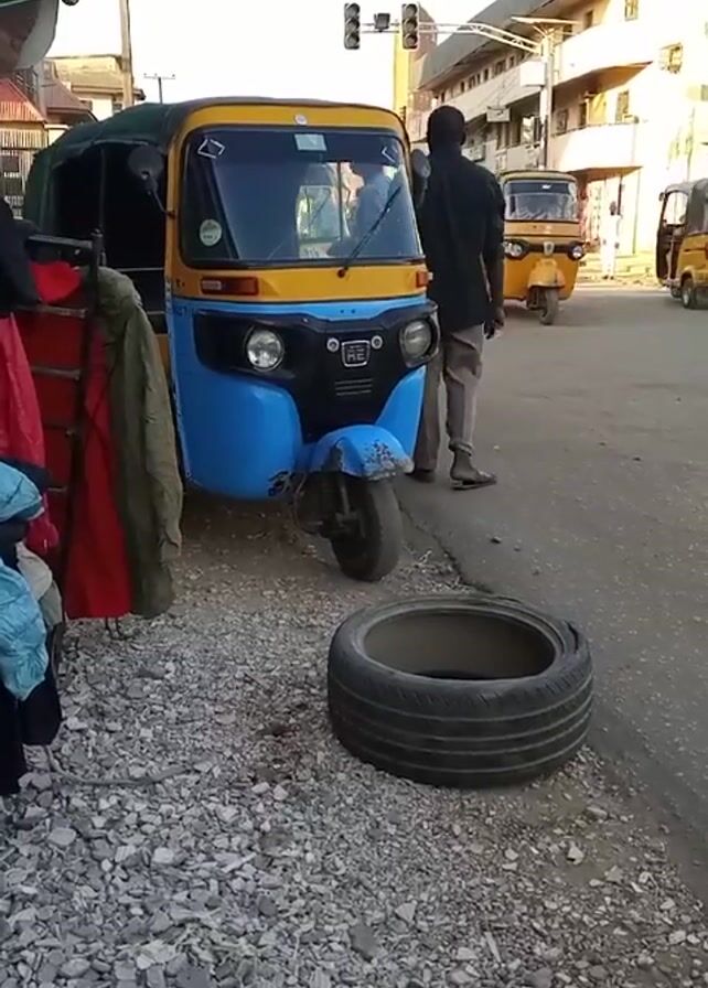 three-wheeled auto rickshaw parked on the side of a road. It has a blue and yellow color scheme. A black tire is lying on the ground next to the vehicle. A man dressed in a black jacket and khaki pants is standing nearby, seemingly looking at the vehicle or the surrounding area. In the background, other similar auto rickshaws can be seen on the road. People are walking and a man is riding a bicycle on the street. The setting appears to be a street in a town or city. The video is taken during the daytime, with ample sunlight.