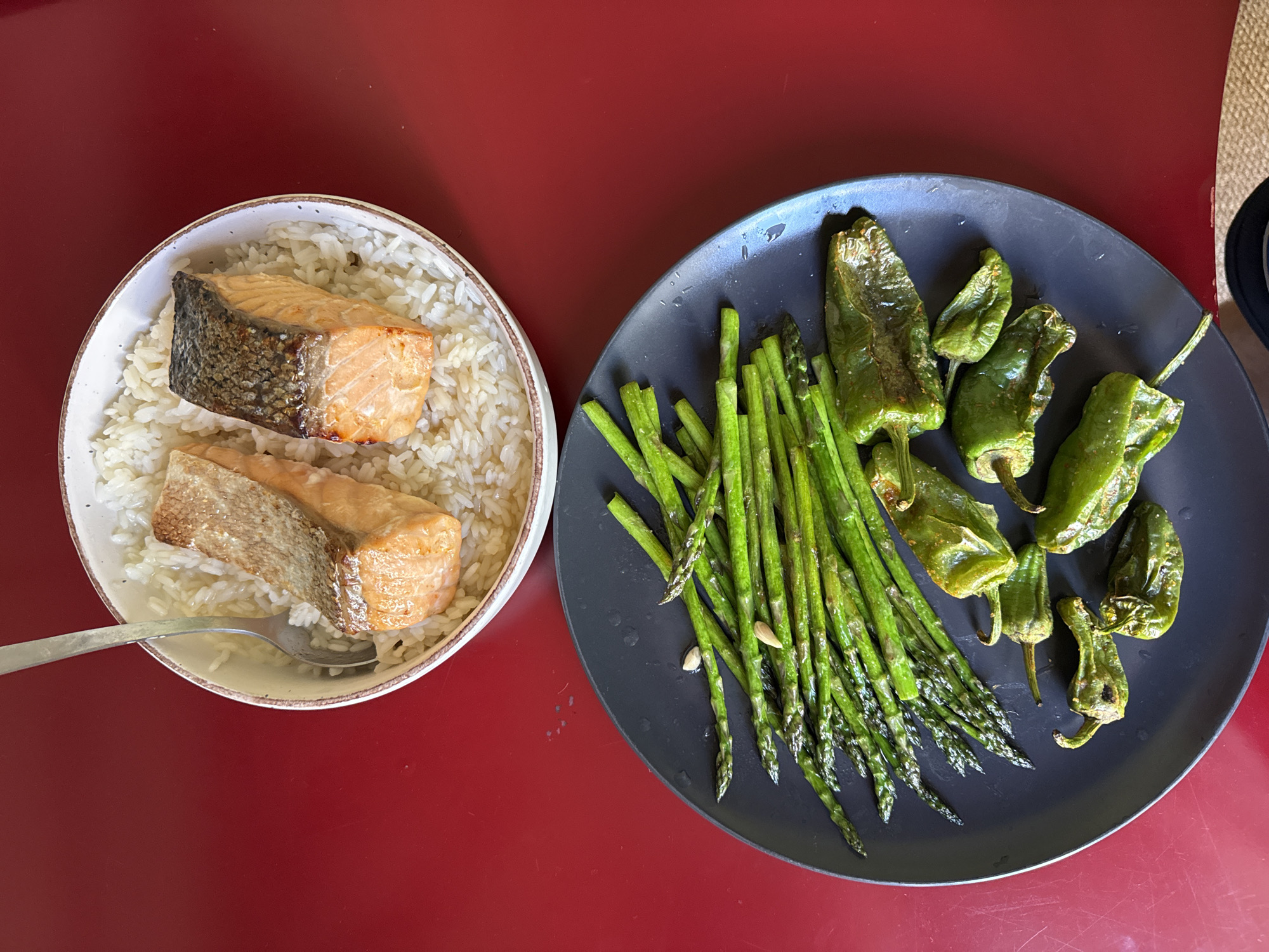 A top-down shot captures a meal arrangement against a red surface. To the left, a white bowl, lined with brown, is filled with white rice topped with two pieces of cooked salmon. A metal spoon rests partially inside the bowl. To the right, a dark gray plate holds a collection of grilled asparagus and blistered Padrón peppers. A portion of a tan-colored surface or object is visible in the upper right corner of the image. The location in Barcelona, Spain, cannot be determined from the visual information.