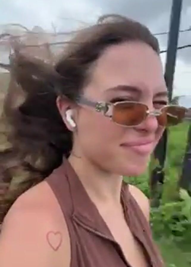 A woman is seen from the shoulders up, outside on a windy day. She is wearing a brown halter top, glasses, and white ear buds. She has a small red heart tattoo on her upper left shoulder. Her long, brown hair blows in the wind. She is looking slightly off camera. The background includes a cloudy sky, power lines, trees and a building with "Prima" visible on it. She appears to be on a sidewalk or road.