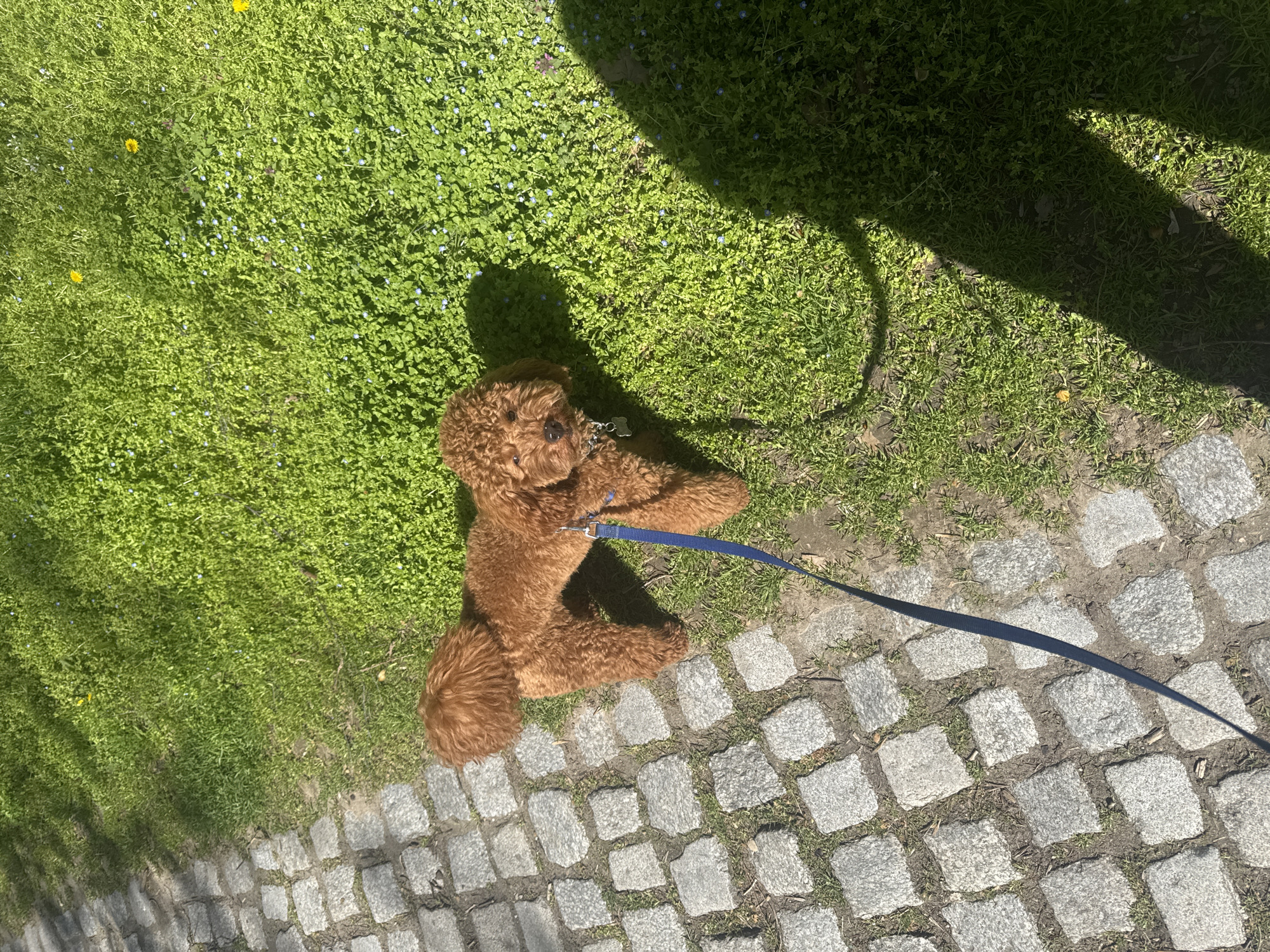 A brown poodle is sitting on green grass beside a stone-paved path. The dog is wearing a collar and is attached to a blue leash that extends off the frame. The scene is bathed in sunlight, casting a shadow of a person or object onto the grass. The grass appears to be a mix of grass blades and other small plants. The location is indicated to be in the city of Kozloduy, Bulgaria.
