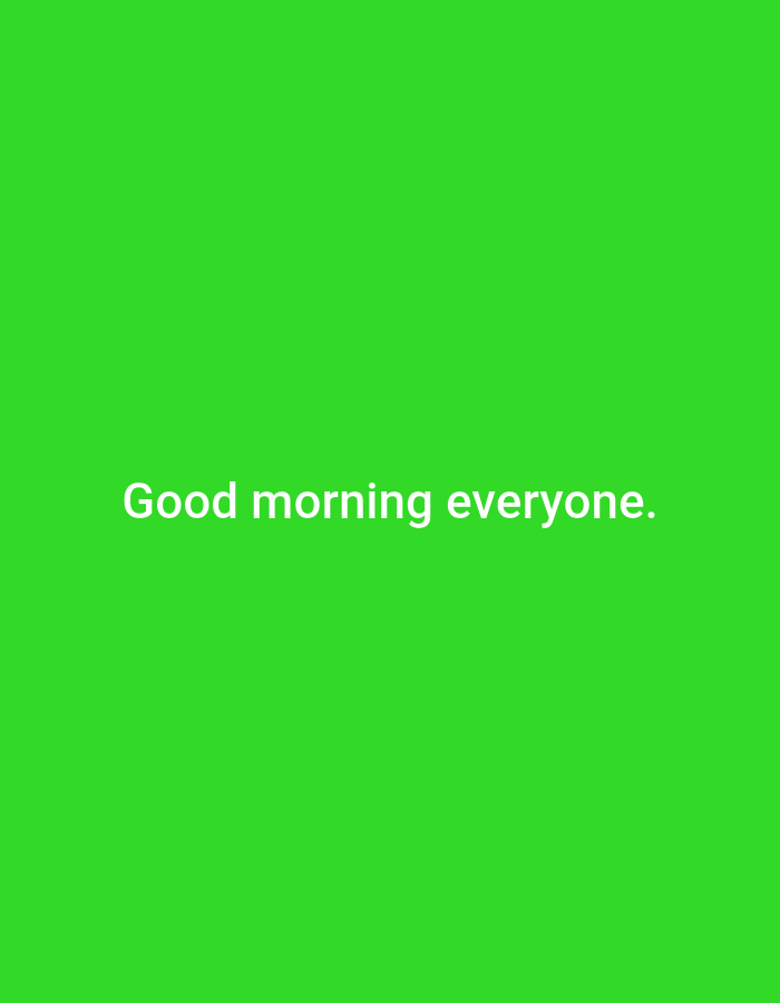 The image displays a uniform, solid bright green background. White, sans-serif text reading "Good morning everyone." is centered horizontally in the lower-middle section of the frame. There are no people, physical subjects, objects, actions, or interactions depicted. The environment is a digital graphic space, not a physical location in the city of Unknown, Unknown.