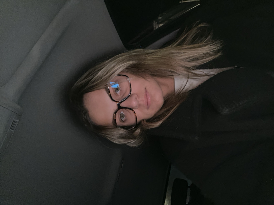 A woman with blonde hair and glasses is angled diagonally in the frame