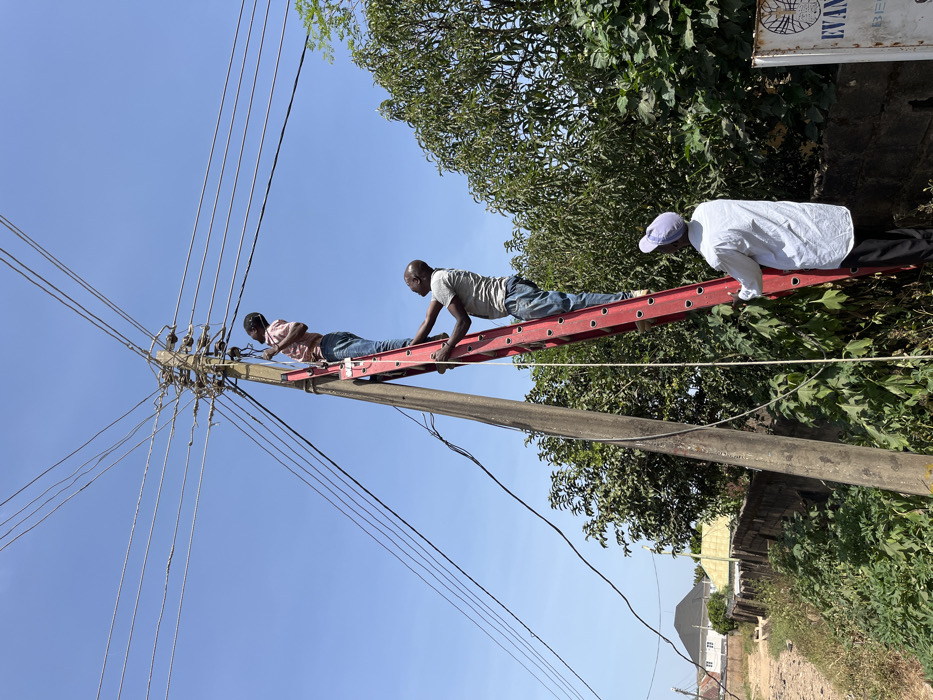 Three adult males are observed engaged in electrical utility pole work under a clear blue sky in Jos, Nigeria