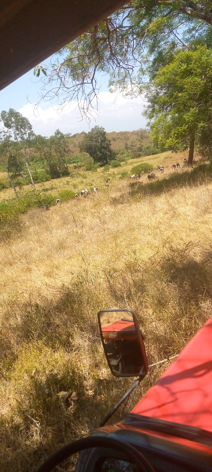 A view from a vehicle, possibly a tractor, shows a field of dry grass with scattered trees. A herd of cattle grazes in the distance, moving towards the right side of the frame. The sky is partly cloudy, with a large tree branch extending from the upper right corner. The vehicle's red hood and a side mirror are visible, giving a sense of being in motion.