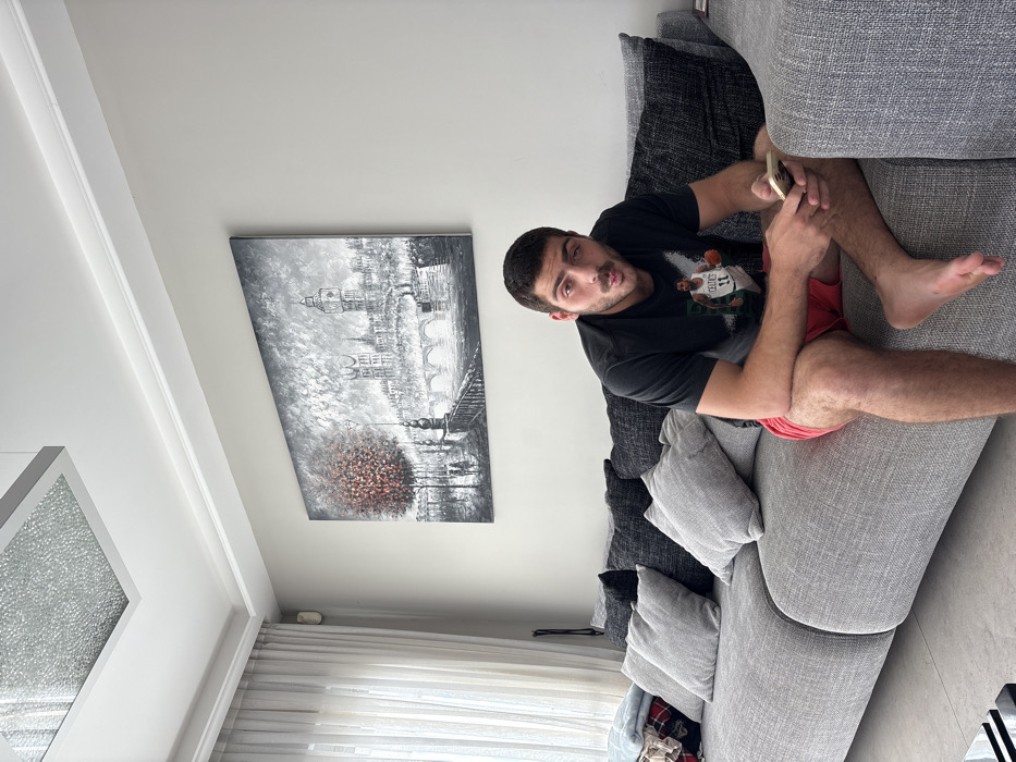 A young adult male, barefoot, is seated on a multi-sectioned grey fabric sofa within an indoor living space located in Rishon LeZion, Israel