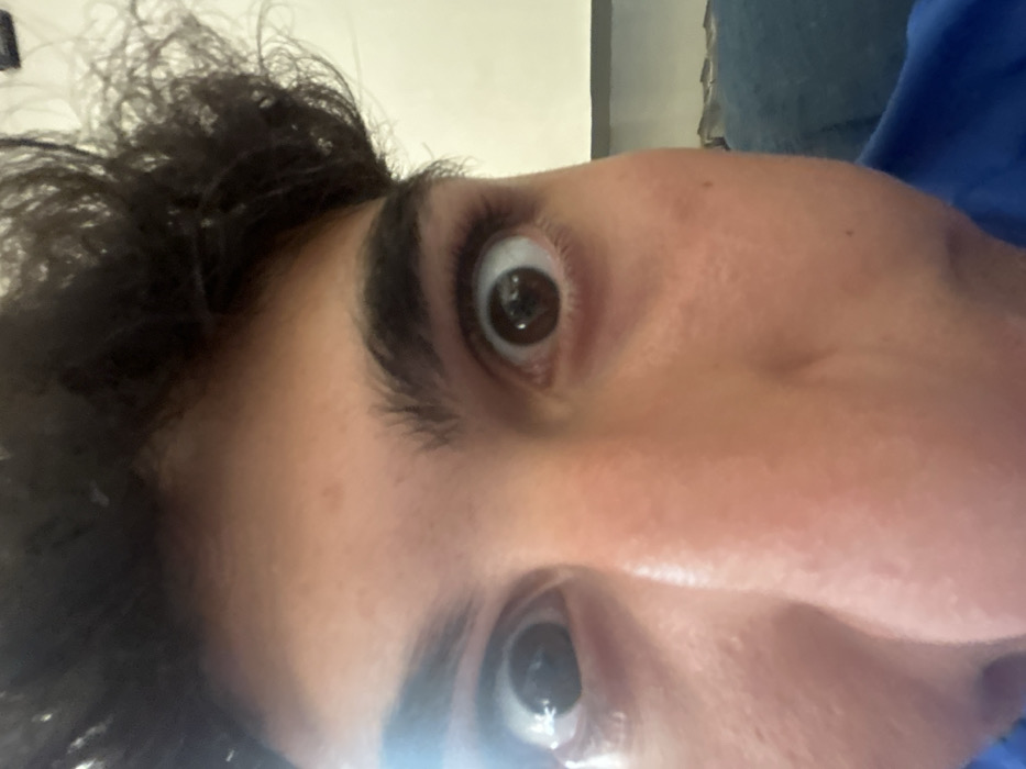 The scene is located in Sarouja Municipality, Syria. The image presents a tightly cropped, close-up frontal view of a human face, encompassing the forehead, eyes, nose, and upper cheeks. The individual has dark, textured, unruly hair visible at the top and sides of the frame. The skin tone is fair. Both eyes are dark brown with noticeably dilated pupils and widely opened palpebral fissures. The nose is prominent and centrally located. A segment of a blue garment is visible in the lower right corner. The background is out of focus, showing a light-colored surface on the left and top right, and a blurred dark blue textile object, consistent with upholstery, on the far right. No other subjects or interactions are present.