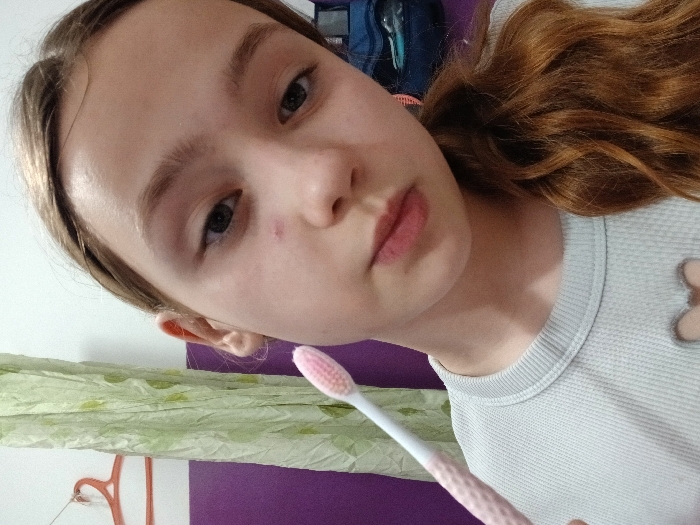 A close-up shot shows a fair-skinned girl holding a pink and white toothbrush. She has brown hair, light gray eyes, and a small mark on her cheek. She is wearing a light gray ribbed top. In the background, there is a patterned curtain, a purple wall, and a clothes hanger. The focus is primarily on the girl's face and the toothbrush she is holding.