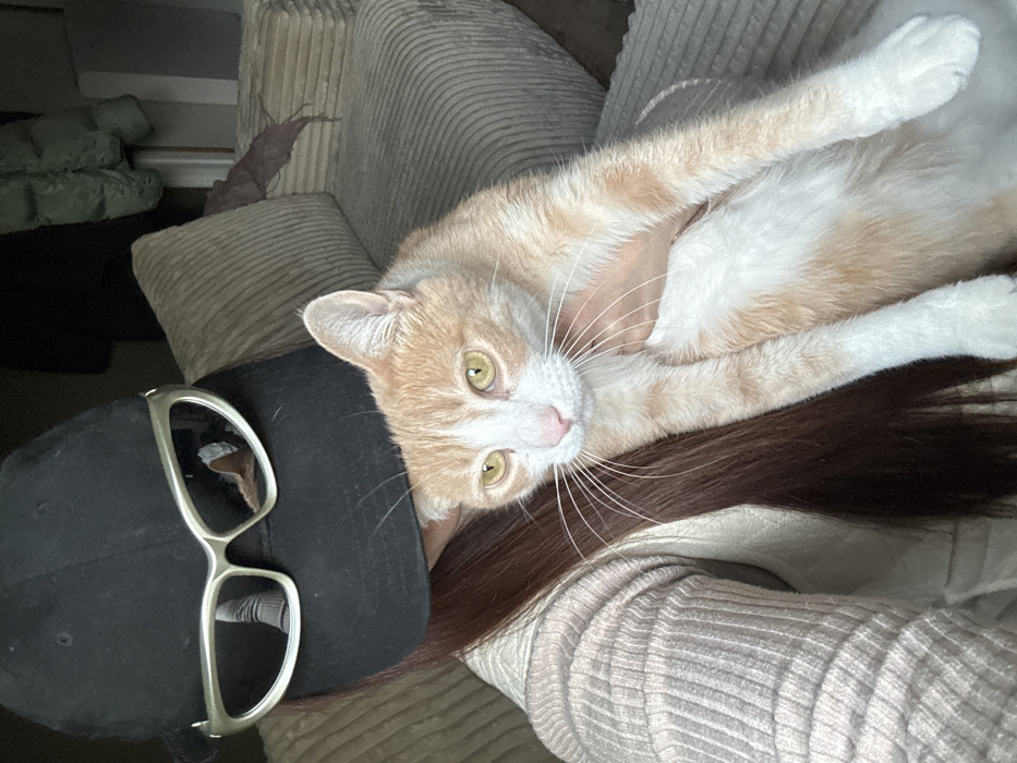 The image depicts an indoor setting in Wattrelos, France. A partially visible human subject, positioned in the foreground, wears a black baseball cap with silver-framed wrap-around sunglasses resting on the brim. Long, dark hair is visible extending from beneath the cap. The individual is dressed in a light beige, ribbed long-sleeved top or sweater. The human is holding an orange and white tabby cat upright, with the cat's full body visible. The cat has yellow-green eyes, prominent white whiskers, and orange fur with white markings on its muzzle, chest, belly, and paws. In the background, a light beige corduroy sofa is visible, along with a dark-colored, padded garment, likely a jacket or coat, hanging in the upper right.