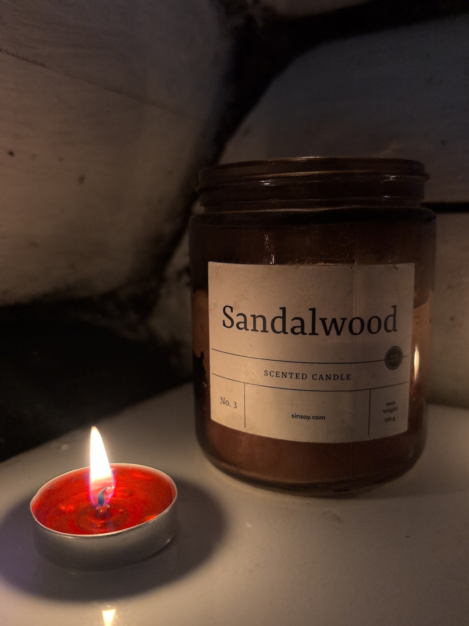 A close-up shot shows a lit red tea light candle positioned to the left of a glass jar candle labeled "Sandalwood Scented Candle" with the brand name "sinsay