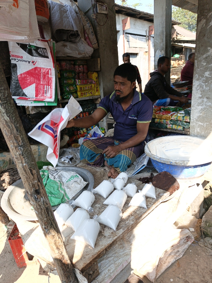 An outdoor market scene features a man in a blue shirt sitting cross-legged. He's surrounded by small, white bags, a blue bowl with a white substance, and other assorted goods. Behind him, a shelf stocked with various items is visible. Additional people are present in the background, some attending to their own wares. The market appears to be in a somewhat run-down setting, with exposed concrete and basic structures. Sunlight illuminates the scene.