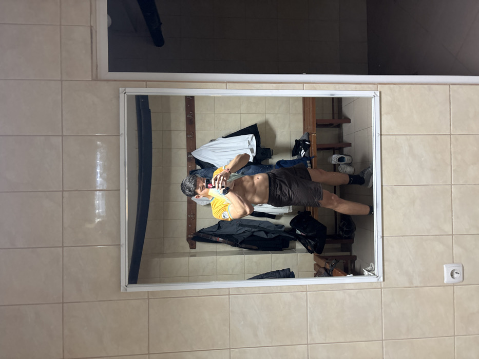 The scene is an interior room, identified as a changing or locker room in the city of Zlatograd, Bulgaria. The walls are uniformly clad in light beige square tiles. A single male subject stands directly in front of a large, rectangular mirror framed in white, actively taking a self-portrait with a black smartphone held in both hands. The subject, exhibiting a muscular physique with visible abdominal definition, is dressed in a yellow short-sleeved t-shirt with green trim, which is pulled up to expose his torso, dark brown athletic shorts, grey athletic shoes, and black socks. The mirror's reflection reveals the room's interior: a long wooden bench positioned against the tiled wall, directly beneath a row of wooden coat hooks. Various items of clothing, including dark jackets and a white shirt, are suspended from these hooks. A black duffel bag rests on the left side of the bench, while two pairs of athletic shoes (one white, one grey) are visible on the right. A black pipe or duct runs horizontally across the upper portion of the reflected wall near the ceiling. To the right of the mirror, an open doorway reveals an adjacent room that appears unlit and dark. A white European-style power outlet is installed on the tiled wall in the lower left area outside the mirror's frame.