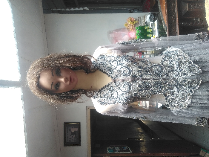 The scene is situated in Almaty, Kazakhstan. A female mannequin, featuring a realistic face with applied makeup and a dishevelled brown wig, stands centrally, displaying an elaborate grey garment. The garment consists of a long-sleeved, sheer top intricately embellished with silver and dark sequins and beads forming swirling patterns, a V-neckline, and a prominent peplum-style waist. The lower portion is a plain grey, sheer skirt. To the left, a dark open doorway is visible, above which a framed document hangs on a white wall, displaying partially legible text, including "TEKNIK SUNTER". To the right, an ornately carved dark wooden surface, possibly a counter or table, holds several green bottles, a pink plastic item, and artificial yellow and orange flowers against a light-colored wall. Bright overhead lighting, likely from a skylight, illuminates the indoor setting. No individuals are present.