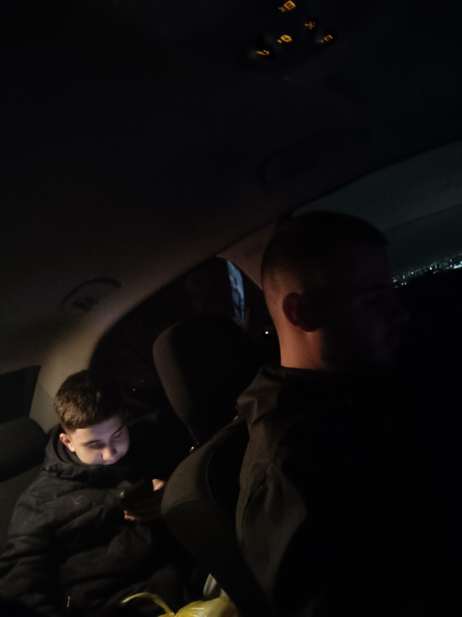 Two people are in the back of a car. The person in the foreground is a man with short hair. He is wearing a dark hooded jacket. In the background to the left, a younger person is looking down at a phone. The interior of the car is dark. The location is likely Asenovgrad, Bulgaria due to the context.