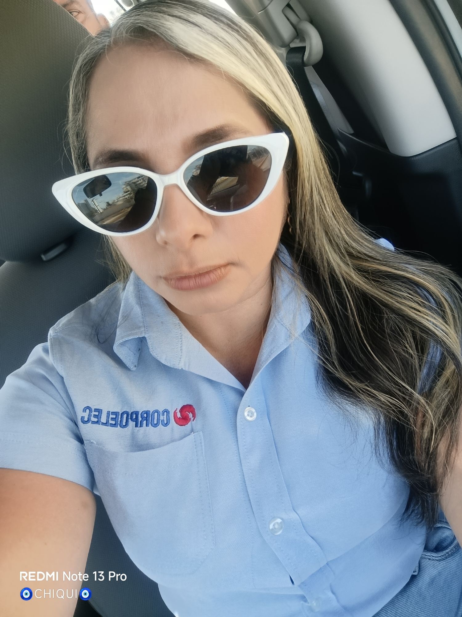 A woman in a blue, collared, button-down shirt with "CORPTEC" embroidered above the left breast pocket sits in the driver's seat of a vehicle. She is wearing white sunglasses. The reflection in the sunglasses suggests she is driving down a road in an urban environment. Based on the "CORPTEC" embroidery on the shirt, this may be in Porlamar, Venezuela, as that company is known to operate in that city. The background shows parts of the interior of the car, including the headrest and window. A small portion of another person is visible near the top left of the image. The lower portion of the image has a watermark with the text "REMI Note 13 Pro 🧿CHIQUI🧿".
