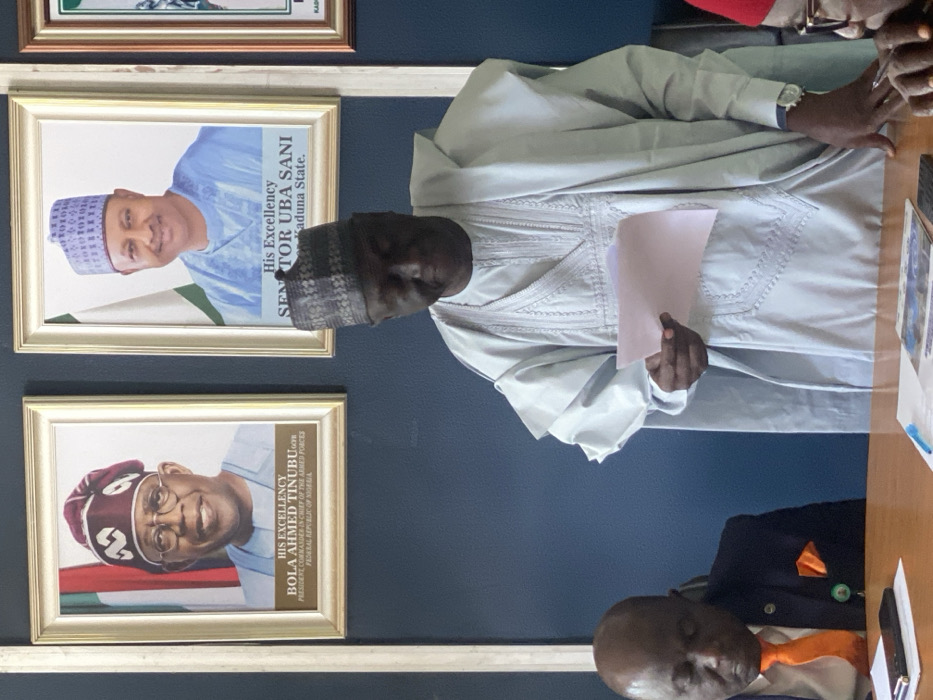 An indoor scene, likely a meeting or official gathering, is depicted in an office setting located in Unguwar Rimi, Kaduna, Nigeria