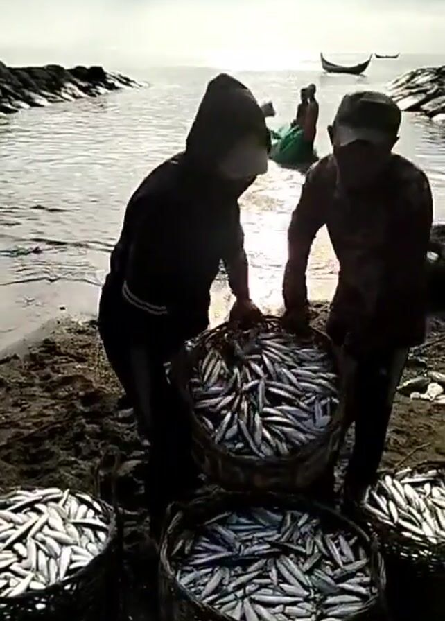 On a sunny beach, two men are bent over woven baskets brimming with small, silver fish. The man on the left wears a dark hooded jacket and a face covering. The man on the right is in a long-sleeved patterned shirt and a cap. More baskets of fish surround them on the sand. In the background, the sun glints off the ocean, with rocks forming a small channel through which two people haul a fishing net towards the shore. A boat is visible on the water.