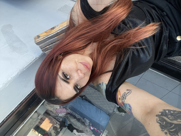 A female subject with long, reddish-brown hair, prominent eyelashes, and freckles on her face is depicted in a selfie, looking directly at the camera with a subtle smile