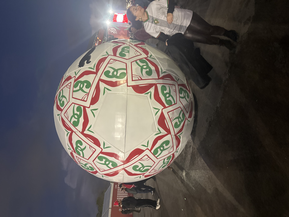 A large, decorative soccer ball with red and green patterns dominates the foreground. To the right, a woman wearing a soccer jersey, black leggings, and boots reclines. In the background, people stand near a structure with visible lights. The surface beneath the ball and the woman appears to be asphalt or a similar dark material. The photo is taken outdoors, possibly during the evening or in low-light conditions.