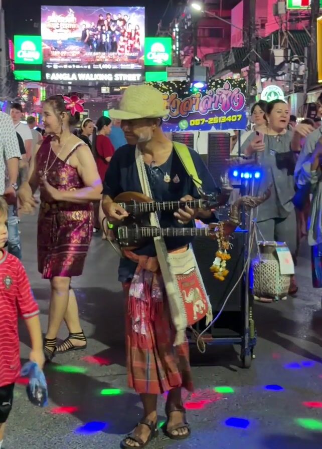 At night, on a pedestrian street in Thailand, a man plays a double-necked guitar while other people dance around him. The man wears a woven hat, a dark shirt, a colorful sarong, and sandals. A young boy in a red and white soccer jersey stands near the camera. In the background is a large electronic billboard that reads "Bangla Walking Street" and several lit store signs. The road is illuminated by multicolored lights. The man's guitar music is amplified through a speaker on a wheeled cart decorated with hanging garlands.