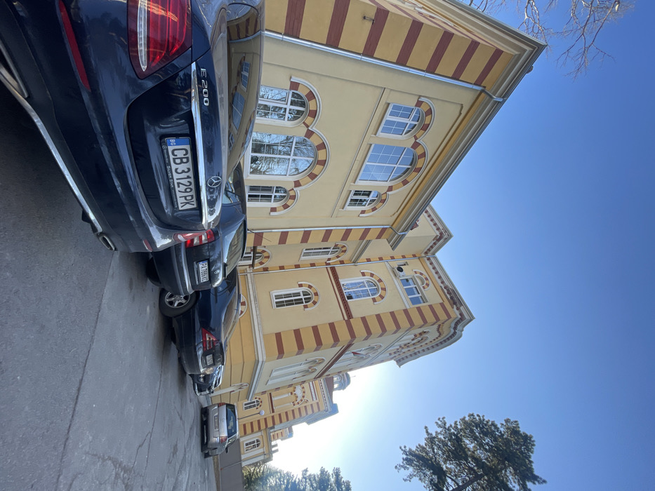 The image depicts a multi-story L-shaped building, identified as Alexandrovska Hospital, located at 1 St. Georgi Sofiyski Street, Sofia, Bulgaria. The building features yellow facades adorned with prominent horizontal red stripes and numerous arched windows with white frames. A silver downspout runs vertically on the left section of the building. Architectural elements include ornate cornices and, in the distance, a cupola atop a taller section. In front of the building, on a paved parking surface, a line of seven vehicles is parked. The closest vehicle, occupying the left foreground, is a dark blue Mercedes-Benz E 200 sedan (W213 generation), facing away from the viewer. Its Bulgarian license plate is CB 3129 PK (Sofia registration), and the plate frame displays "Silver Star BG". Immediately behind the Mercedes is a dark grey Skoda Fabia hatchback with Bulgarian license plate PA 7886 KC (Plovdiv registration). Following the Skoda is a dark blue Mercedes-Benz C-Class (W203) sedan, then a dark grey SUV or large hatchback, and another dark sedan. On the far right, a silver compact SUV or hatchback is parked at an angle. The scene is under a clear blue sky, with bright daylight illuminating the building and vehicles. Bare tree branches are visible in the upper left quadrant, while a tall pine tree stands in the upper right.