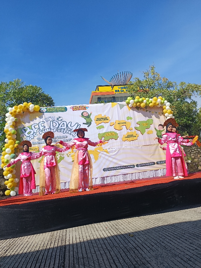 Four children in pink, orange, and gold traditional attire perform on a stage with a world map backdrop. The banner behind them reads "Bee Fun Festival" and lists various competitions. Yellow and white balloons frame the banner. The event appears to be held by "Bunga Persada Primary School." The performance takes place outdoors on a sunny day, with trees and a building visible in the background.