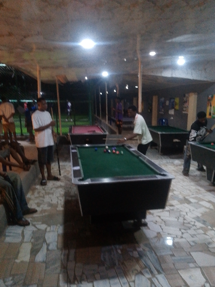 Under a dimly lit, partially covered structure, several people gather around multiple pool tables. Two individuals actively play, one taking a shot, while others observe. The pool tables are of varying colors, and the surrounding area has a rustic tile floor. The lighting is sparse, with several bulbs illuminating the scene. Some posters and decorations are visible on a wall in the background.