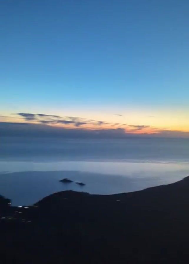 The video displays a tranquil landscape featuring a mountainous terrain in silhouette against a breathtaking twilight sky. The sky transitions from a deep blue at the top to a band of orange and yellow near the horizon, where the sea meets the sky. The sea is visible as a vast, reflective surface, with some light reflecting the twilight hues. There are two small islands in the sea. The silhouette of the mountain range dominates the foreground, with small dots of light suggesting settlements or structures on the slopes. In the background, an individual can be heard talking.