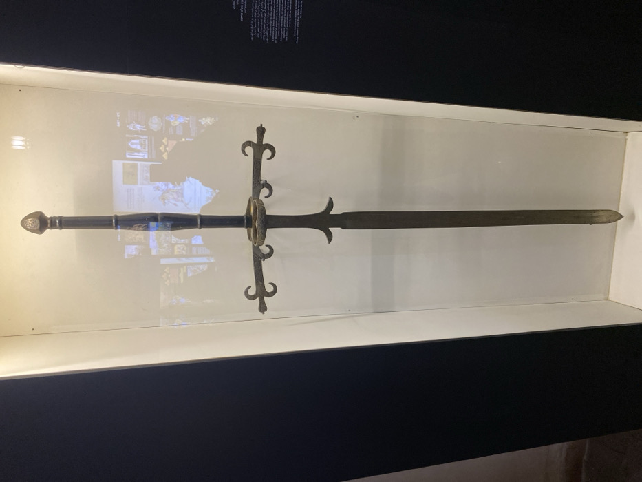 - "An antique, longsword-style weapon is displayed vertically within a clear, glass-fronted exhibit case with a white interior back panel, located in Mechouar Fes Jdid, Morocco" by FM-HlXDJ3, licensed under CC BY 4.0