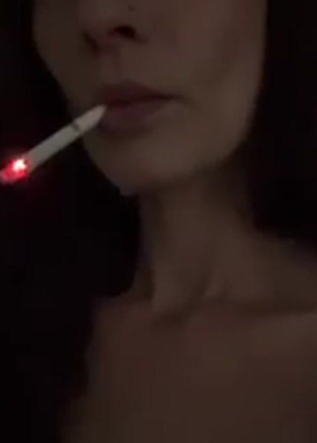 A person with long, wavy, dark hair and a nose piercing is holding a lit cigarette between their lips. The person has tattoos visible on their shoulder and arm. The background is blurry but appears to be a plain wall with a partially visible framed item. The lighting is dim, creating a shadowy atmosphere. The camera focuses on the person's face and upper body.