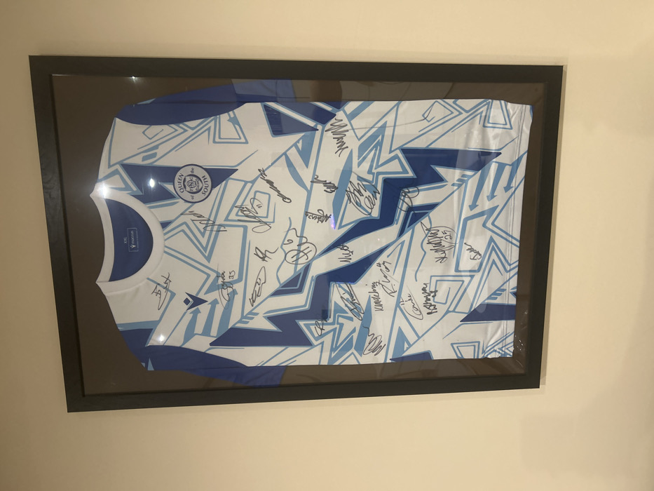 A white and blue sports jersey is displayed within a rectangular black frame, mounted vertically on a light-colored, possibly beige or off-white, wall