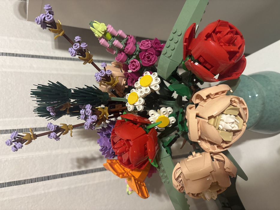 - "The image displays a close-up view of a static bouquet of artificial flowers constructed from interlocking plastic bricks, arranged in a light teal ceramic vase" by FM-rJJXF3, licensed under CC BY 4.0