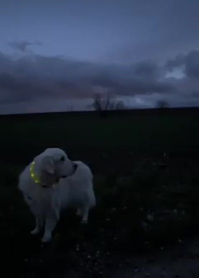 large, white dog standing in a dark field at dusk. The dog is wearing a glowing collar. The sky is cloudy and dark. There are a few bare trees visible in the distance.