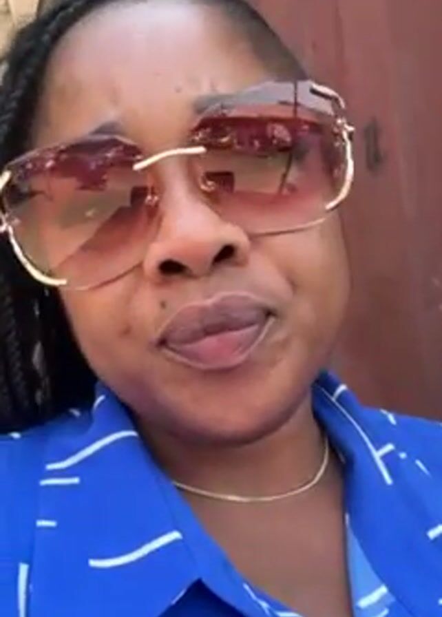 A woman with dark skin and braided hair, wearing large, gold-rimmed sunglasses with a gradient tint, a blue shirt with white vertical stripes, and a delicate gold necklace, looks directly at the camera with slightly pursed lips. She appears to be outside, judging by the exterior of a red container in the background and the sunlight. The camera is close-up, focusing primarily on her face.