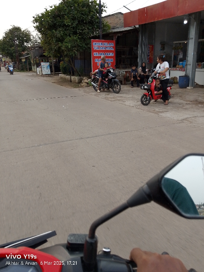 street scene in Kecamatan Gabuswetan, Indonesia, taken from the perspective of a motorcycle rider. The rider is driving down the road towards a storefront on the right. The storefront has a large red sign that reads "GROSIR KELAPA TUA DAN MUDA, KELAPA PARUD GILIRU UMU" in Indonesian. There are two motorbikes parked in front of the store, and three people are standing near them. A red motorbike with a child on the back is moving towards the camera. The image is taken from the perspective of a motorcycle rider who is holding the handlebars. The road is paved and there is a black line painted in the center. The day is clear and the sun is shining.