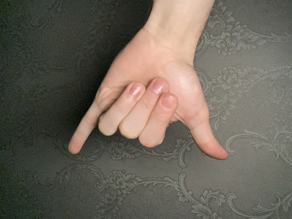 A light-skinned human hand is positioned against a dark gray surface patterned with floral designs. The hand is posed with the index and little fingers extended, resembling the "hang loose" sign. The middle and ring fingers are curled towards the palm. The nails are short and appear to have a glossy finish. The background pattern is visible through the gaps between the fingers.